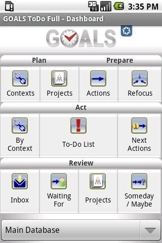 GOALS ToDo is the ultimate personal task manager, featuring a to-do list, Getting Things Done (GTD) support and lots of fresh ideas. Seamlessly integrates with your phone's calendar, maps and contacts. Includes a widget and extensive help features to get you started.